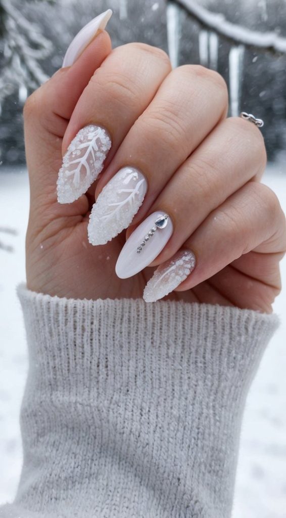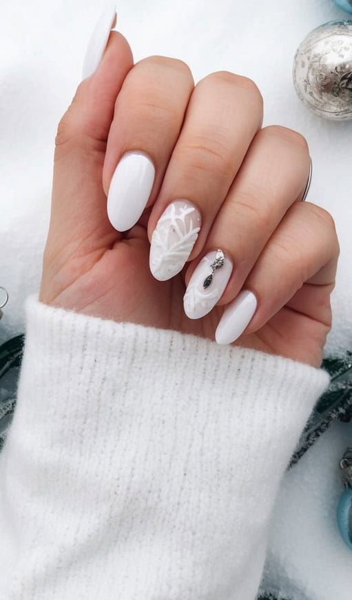 This design pairs white polish with intricate frosted leaf patterns and shimmering rhinestones. The textured snowy accents evoke a crisp, winter wonderland-inspired aesthetic.